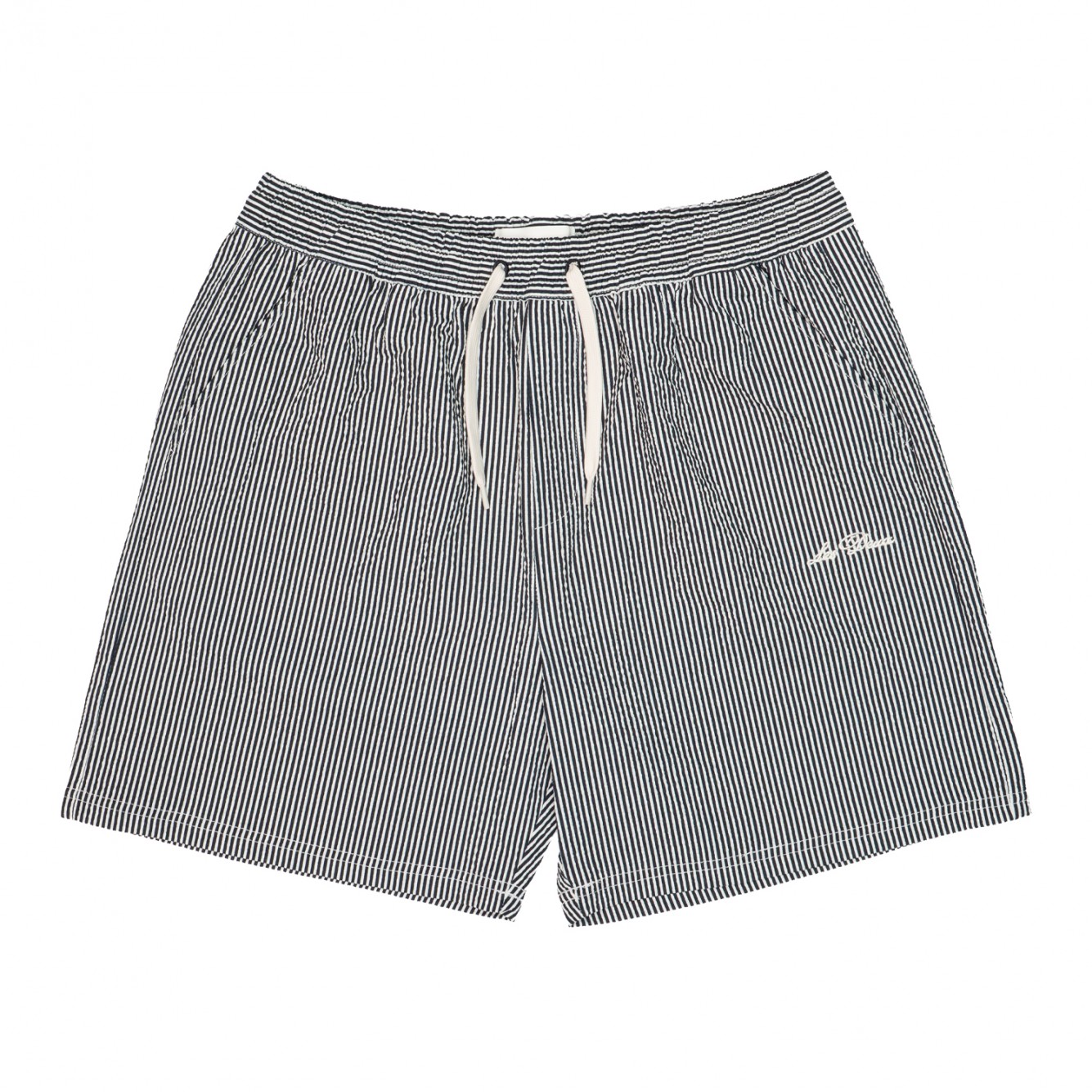 Boxer da bagno in seersucker a righe con superficie testurizzata e taglio rilassato. Con elastico in vita e delicato ricamo frontale.