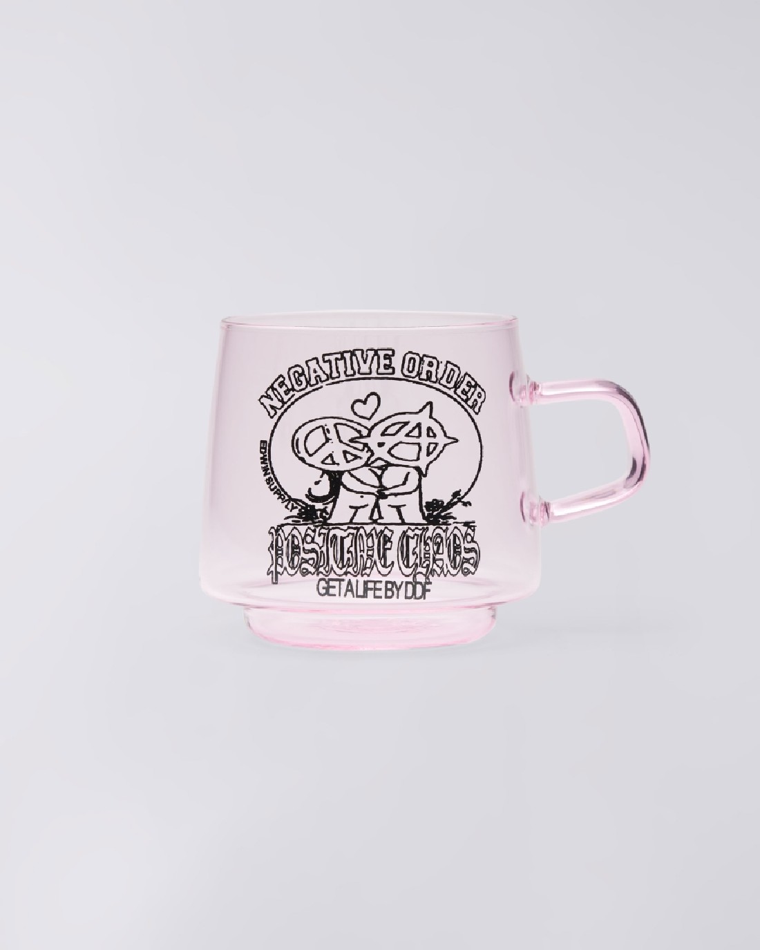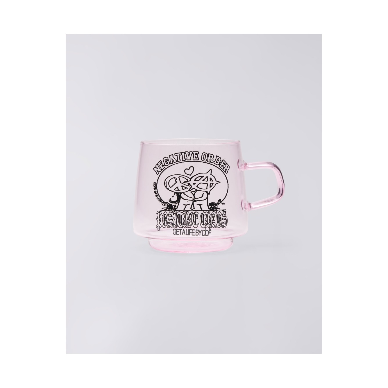 La tazza da caffè in vetro è un elegante pezzo realizzato in puro vetro. Presentata in rosa con il design Positive Chaos, questa tazza è impilabile e adatta a contenere bevande calde o fredde.
