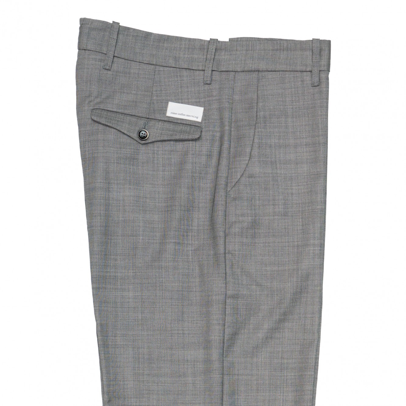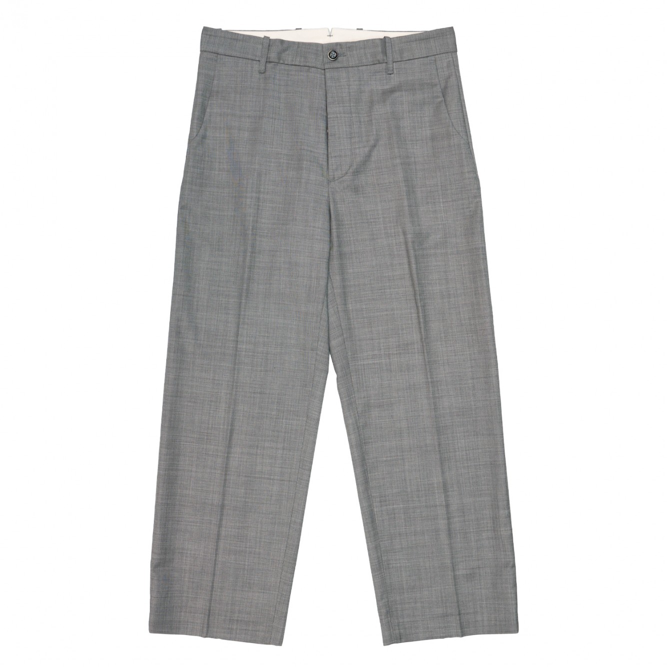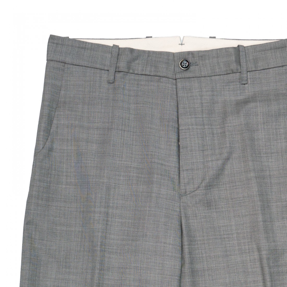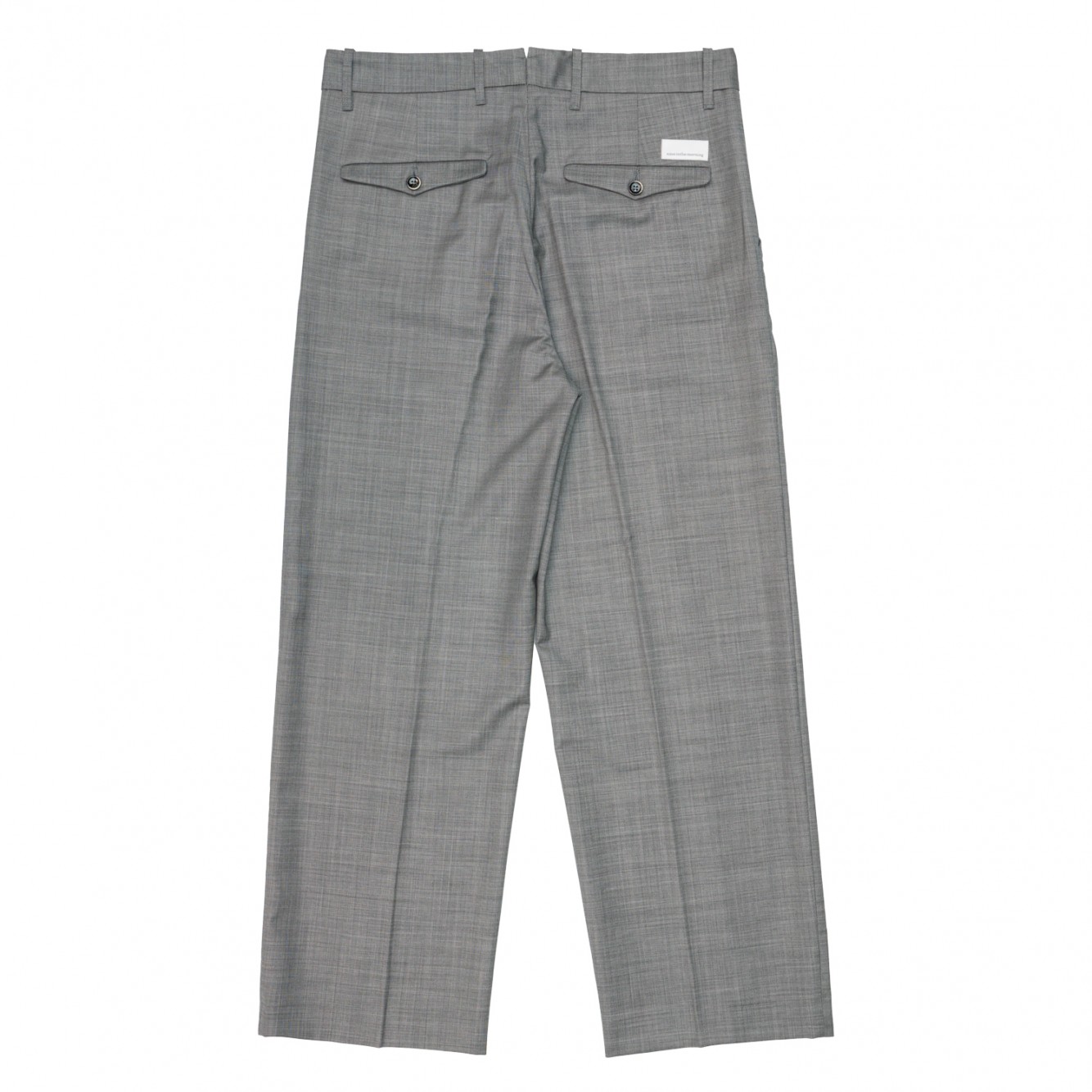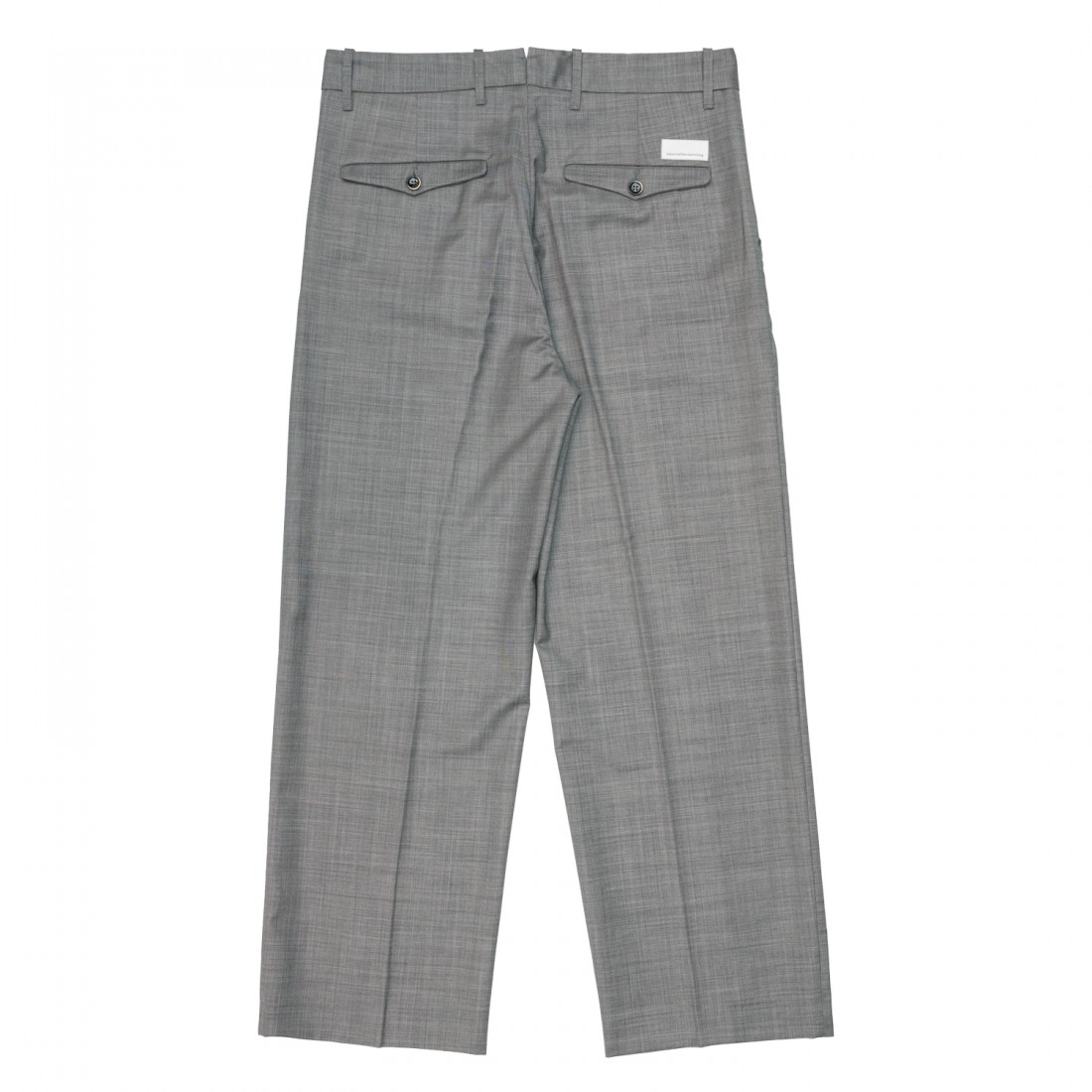 Pantalone baggy in morbida tela lana giapponese, chiusura bottoni in corno, tasca a pattina, etichetta con logo sul retro.