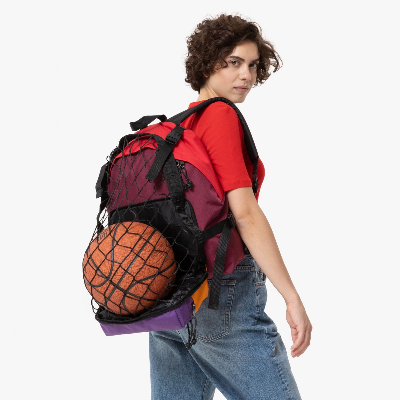 Scomparto principale e tasca anteriore dotata di chiusura a zip con rete per trasportare un pallone da basket